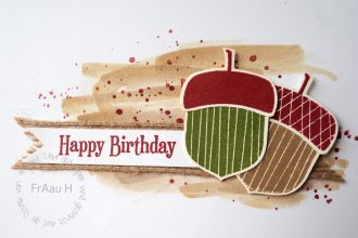 Endlich komme ich mal wieder dazu, einen Beitrag zu schreiben und eine Geburtstagskarte zu zeigen, für die ich mal wieder die Eichelstanze verwendet habe. Jetzt im Herbst ist das eindeutig mein Lieblings „Werkzeug“! Den Hintergrund hab ich mit dem Wassertankpinsel bemalt, die Spritzer sind in Chili gestempelt. Hier kam mal wieder das Stempelset Gorgeous Grunge […]